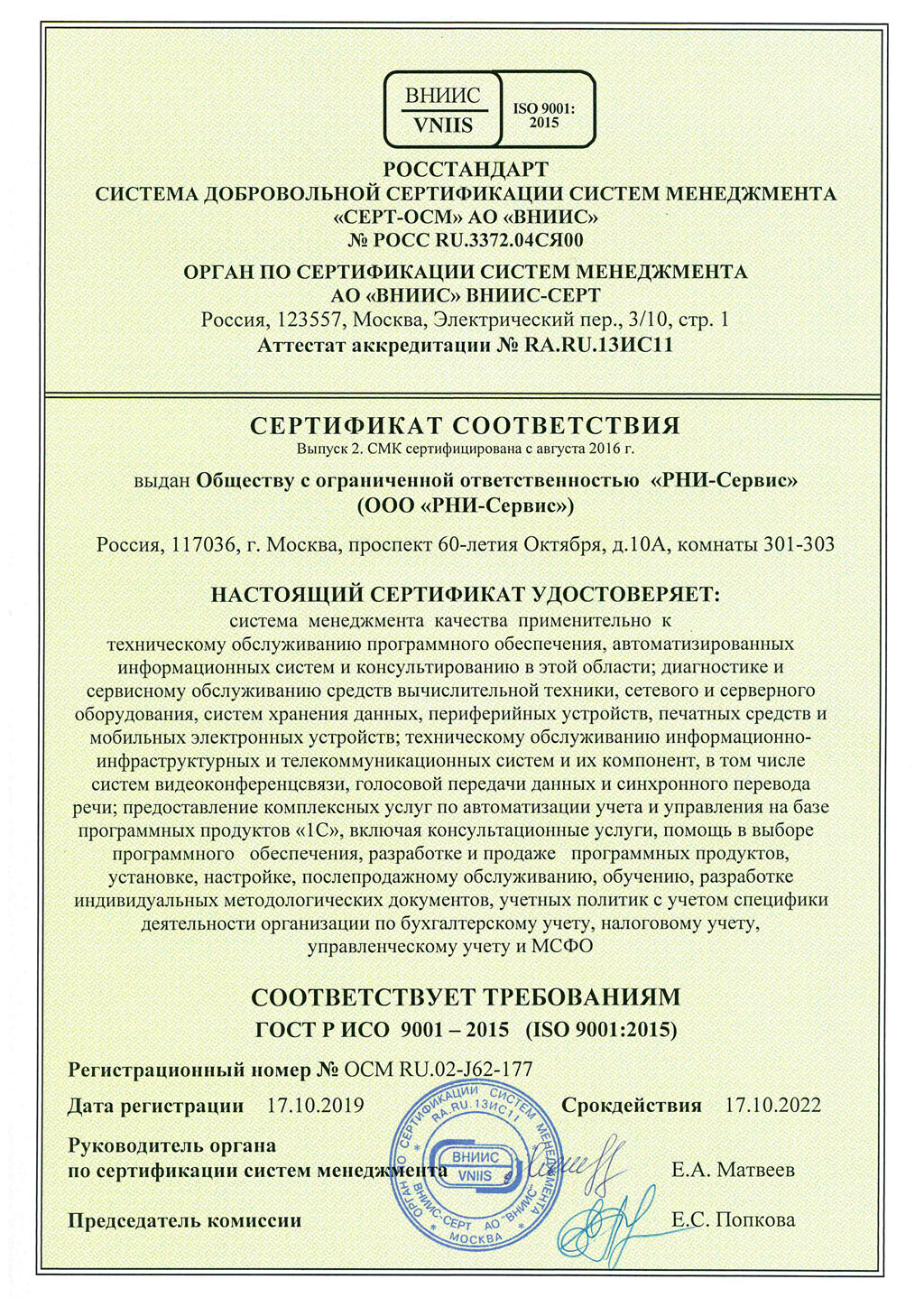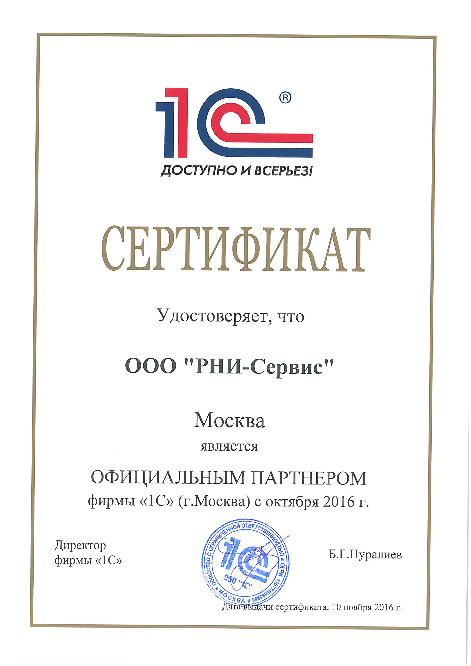 Компания «РНИ-Сервис» входит в число сертифицированных партнеров «1С». Это очередной шаг в развитии направления автоматизации бизнеса и официальное подтверждение экспертизы качества предоставляемых услуг ООО «РНИ-Сервис» со стороны «1С».